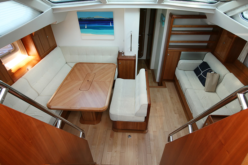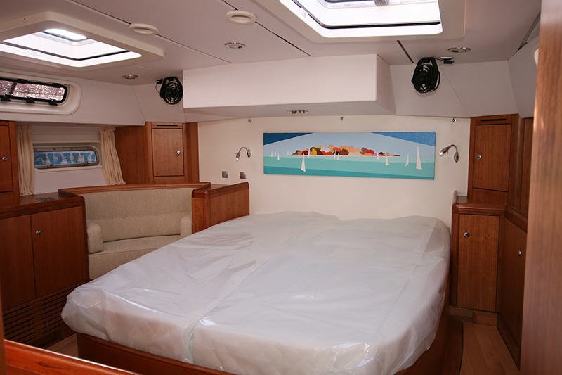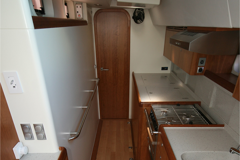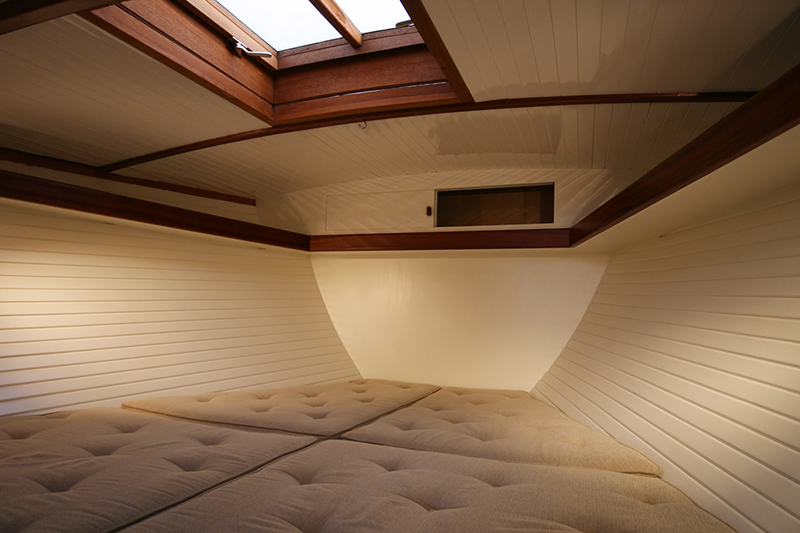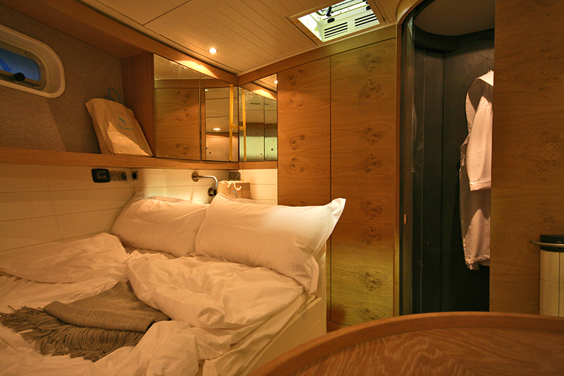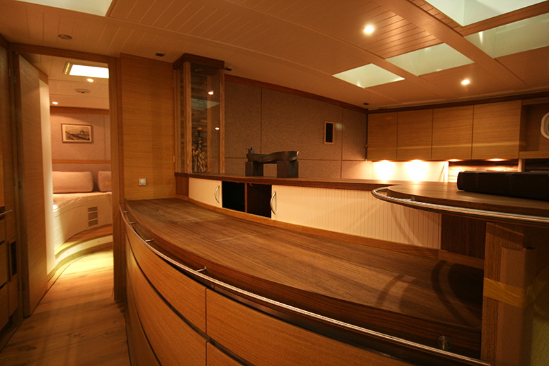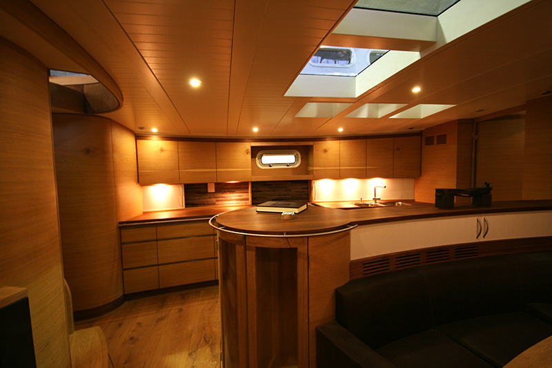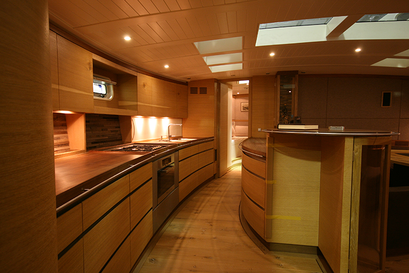 Segelboot in 68 Fuß, Zweimaster, Innenausbau in gebürsteter Eiche, weiß gekälkt. Fronten in Vakuum verleimt in Sandwichkonstruktion. Arbeitsplatten in Nussbaum massiv.