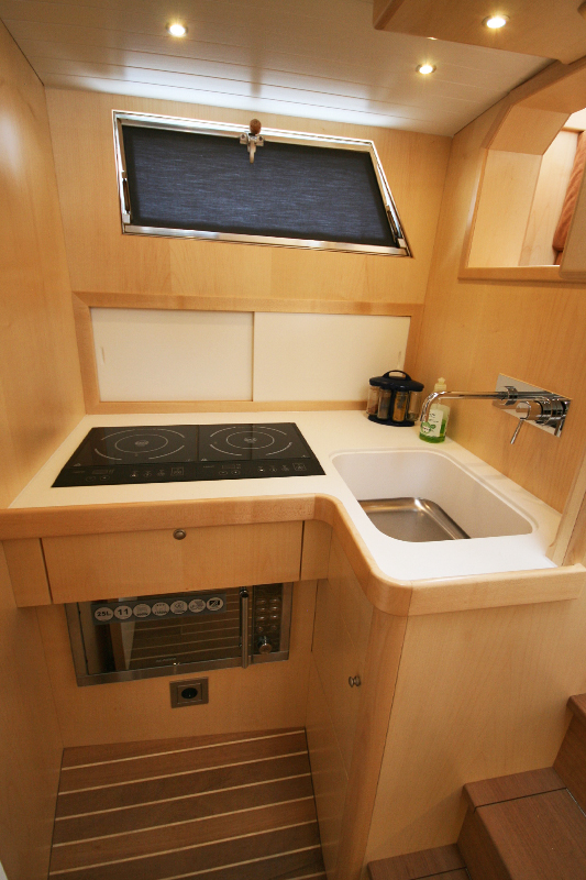Motorboot in Ahorn, Arbeitsplatten in der Küche und im Bad aus Corean. Sehr schöner, den engen Gegebenheiten angepasster Innenausbau.