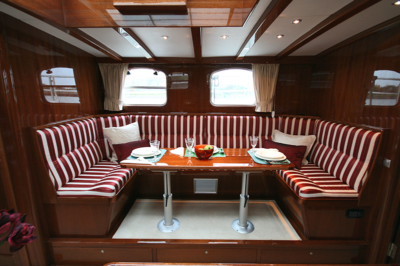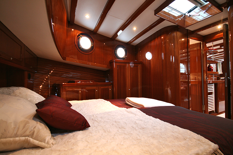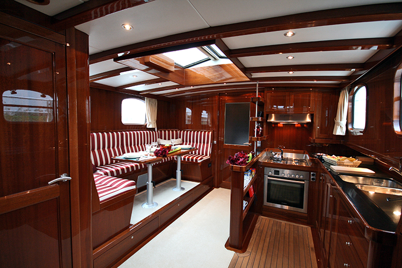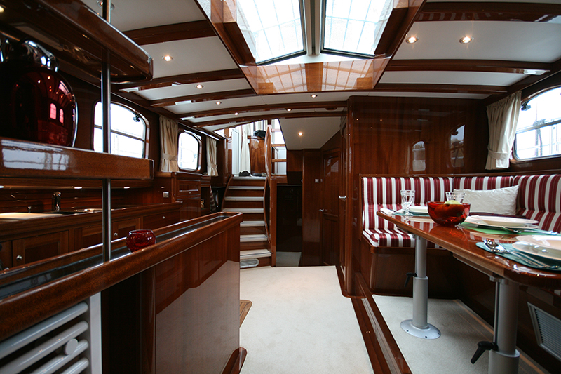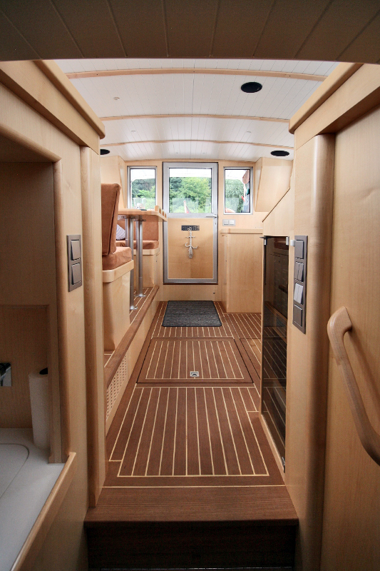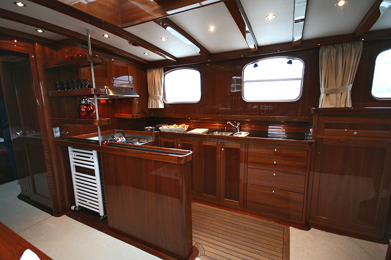 60 Tonnen schweres Motorboot, mit Fußbodenheizung in Mahagoni hochglanz lackiert. Arbeitsplatten in Granit.