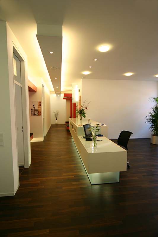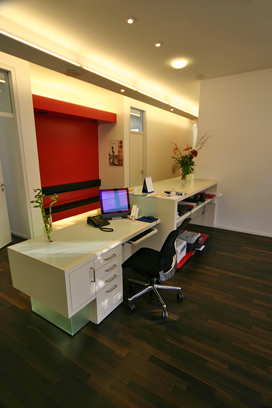 Gezeigt wird hier eine Schönheitsklinik, gebaut in weiß lackierer Optik mit hinterleuchtetem ESG Glas sowie funtionalen Möbeln.