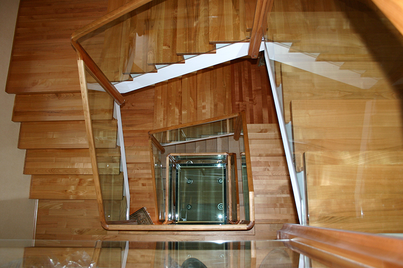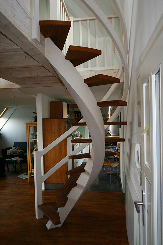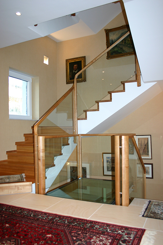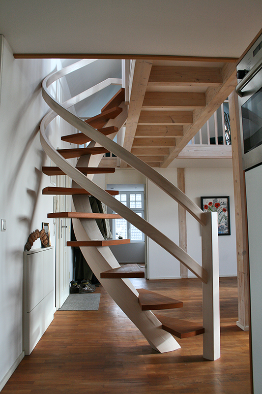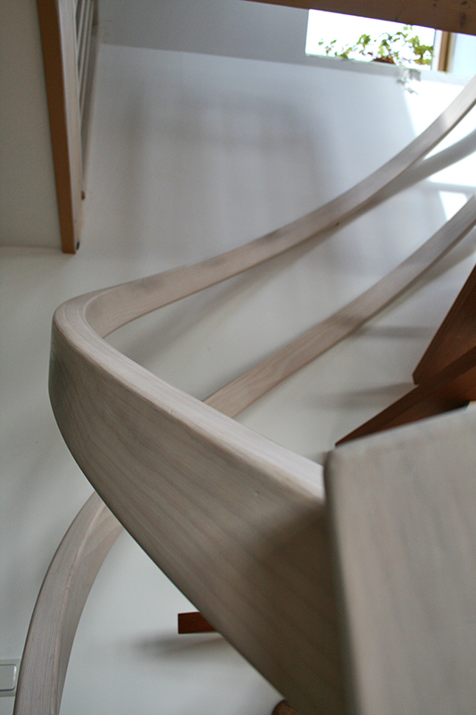 Hier bestand die Aufgabe darin, einen Treppenlauf in ein eigentlich zu kleines Treppenloch zu konstruieren. Dieses gelang durch die freigezogene Treppenholmkonstruktion mit frei schwebenden eingelassenen Stufen. Holm und Handlauf sind formverleimt und geben der Treppe eine skulpturartige Optik.