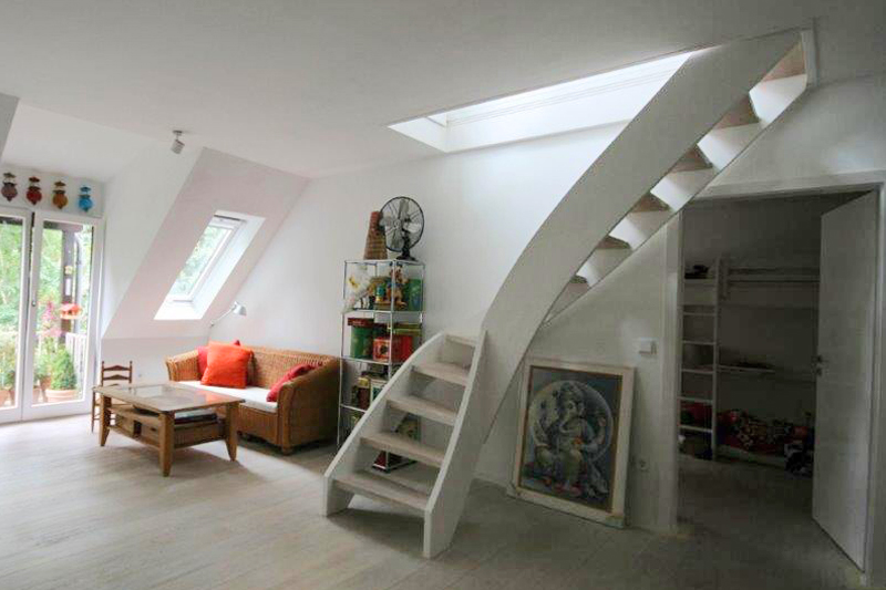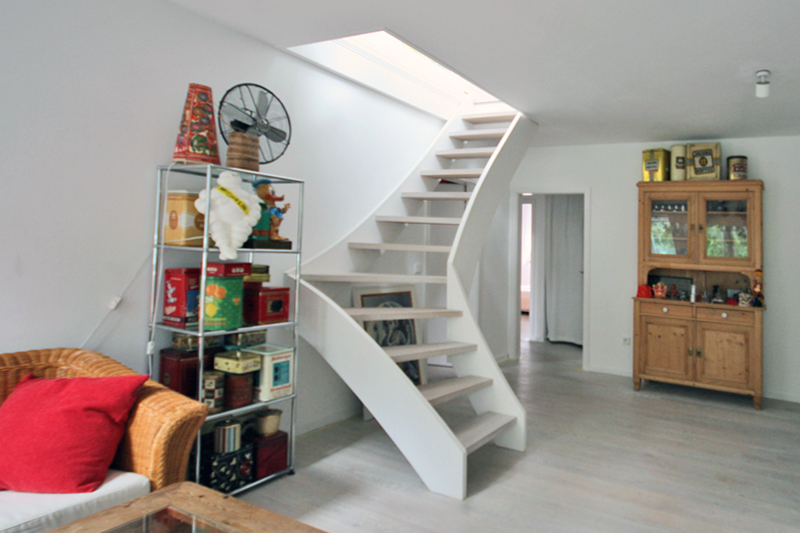Hier bestand die Aufgabe, die vorher hier eingebaute Spindeltreppe durch eine viertel gewendete Treppe zu ersetzen. Die Spindeltreppe hatte einen Durchmesser von 1,4 m, so das der Raum dadurch massiv eingeschränkt wurde. Um die Treppe zu realieren, musste die Betondecke aufgeschnitten werden. Die bessere akustische Trennung zum Obergeschoss wurde wie im Bootsbau üblich durch eine Schiebeluklösung erreicht, deren Elemente können unter dem Fußboden eingeschoben werden.