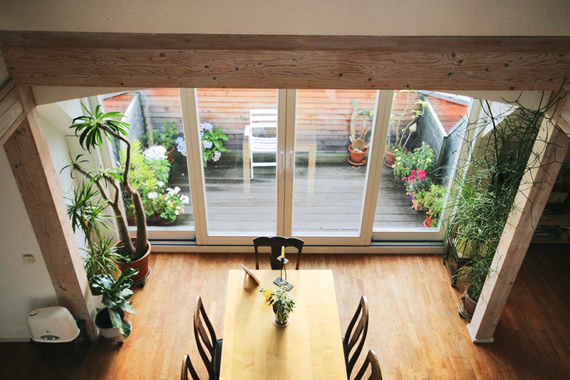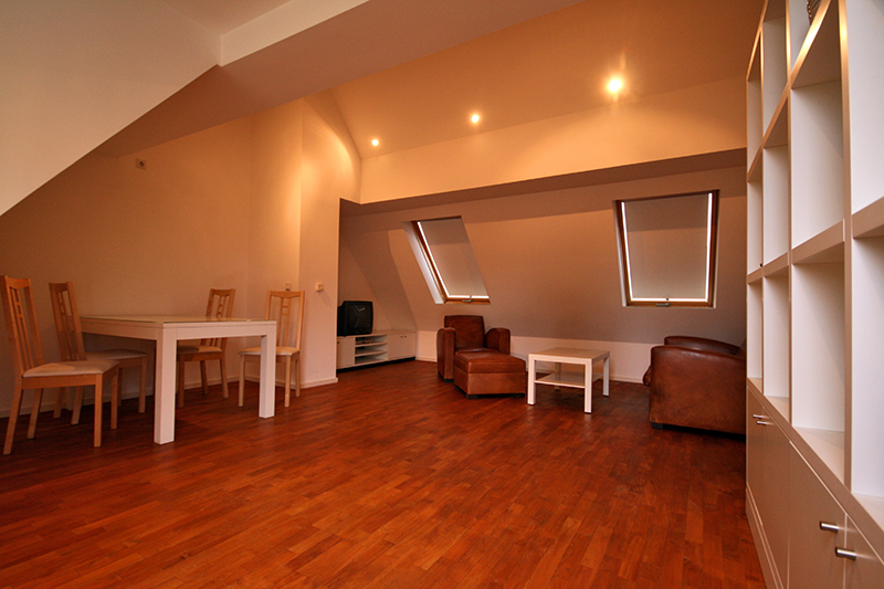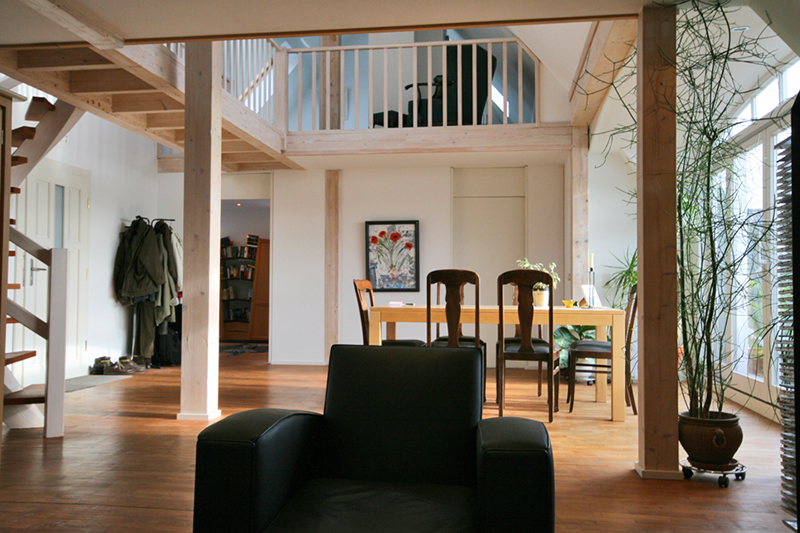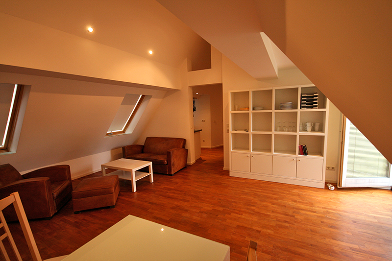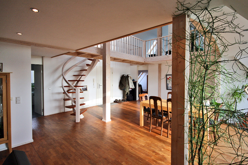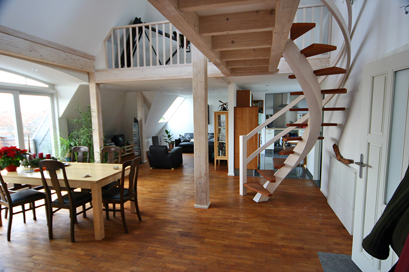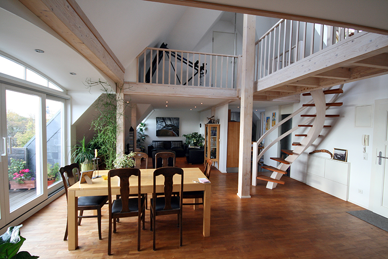 Hier war die Aufgabenstellung, eine Wohnung auf zwei Ebenen in einem denkmalgeschützen Dachstuhl zu bauen. Dazu musste das Treppenhaus nach oben mit einer Stahlbetontreppe neu erschlossen werden, der gesamte Dachstuhl wurde erneuert, damit natürlich auch die Dacheindeckung aus Bieberschwanzziegel, Fußbodenheizung, Marmorbäder, raumhohe Türen, eine sehr gewitze Treppe, Einbauschränke, Parkettboden aus Teak etc. Design, Ausführung, Bauleitung alles unter Bauleitung Brune.