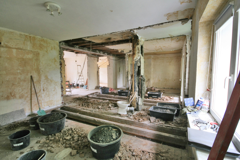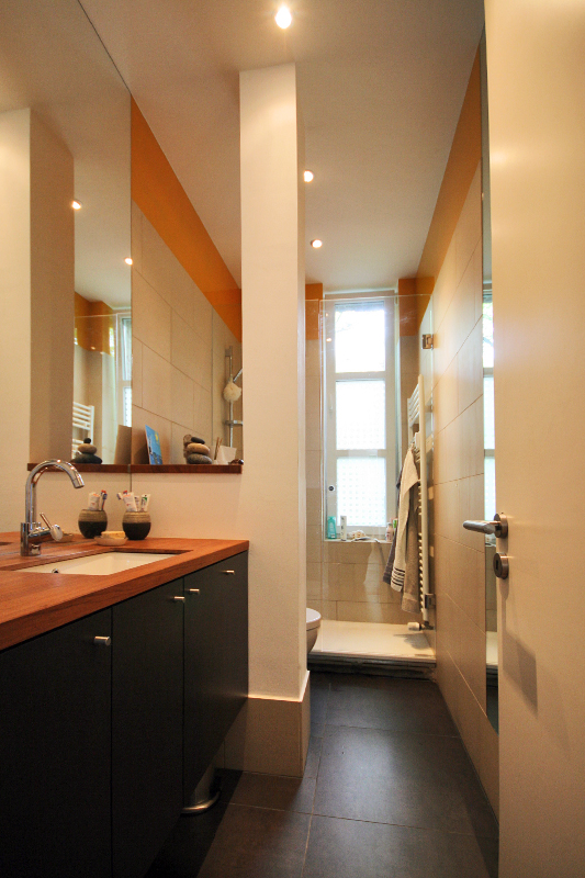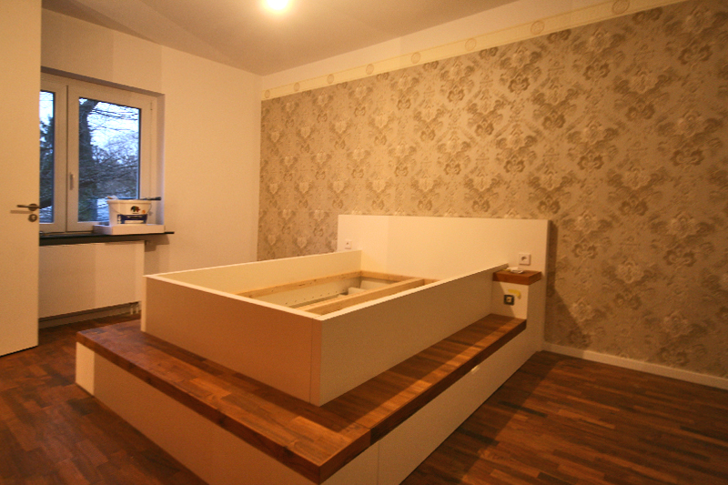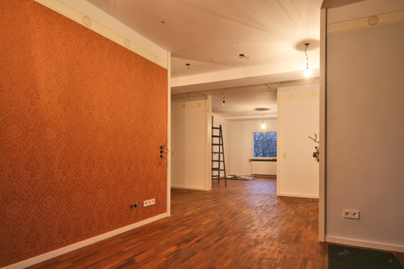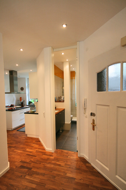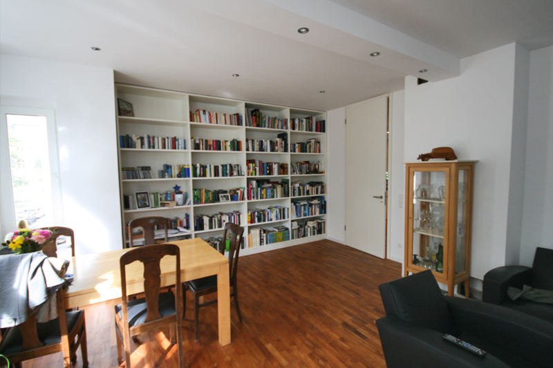 Hier war die Aufgabe, den Grundriss der Wohnung zu verändern, d.h. eine Wand zu entfernen. Dementsprechend war ein Stahlträger einzuziehen, das Bad zu vergrößern, einen Trockenestrich einzubauen um absolut ebene Fußbodenflächen zu schaffen, mit stufenlosen Übergängen zwischen dem Massivparkett und den Badezimmerfliesen. Ergänzt wurde das alles mit raumhohen Schränken, Türen und einer Bibliothek.